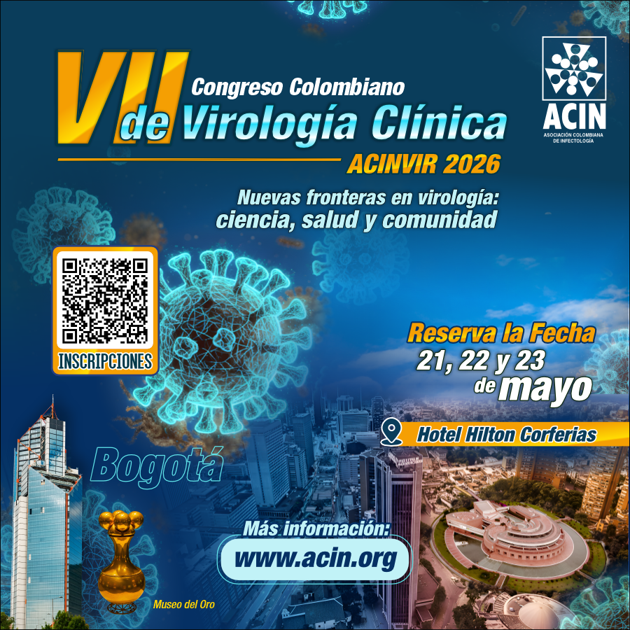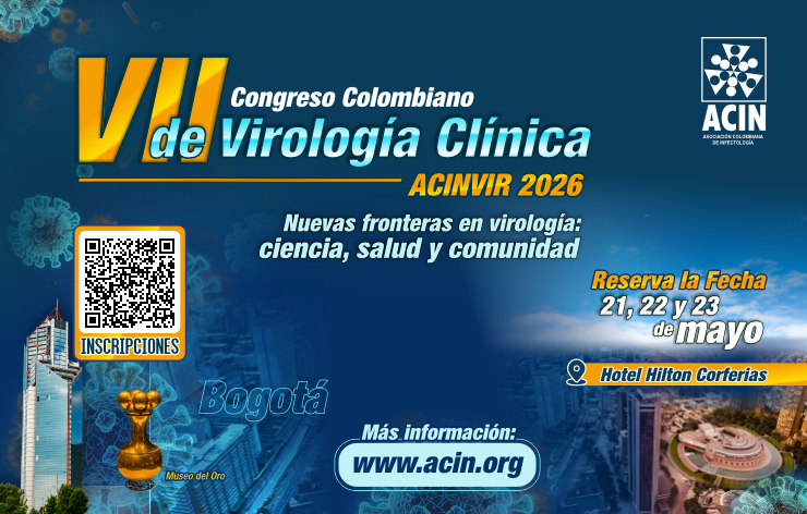 VII Congreso Colombiano de Virología Clínica ACINVIR 2026 + Añadir Google Calendar + exportación iCal / Outlook 00 días 00 horas 00 minutos 00 segundos Fecha May 21 - 23 2026 Más Información Leer más Localización Hotel Hilton Corferias Bogotá Filtro por Sociedad ASOCIACION COLOMBIANA DE INFECTOLOGIA Teléfono 2153714- 2153517 Correo electrónico secretaria@acin.org Web http://www.acin.org REGISTRO Compartir este evento