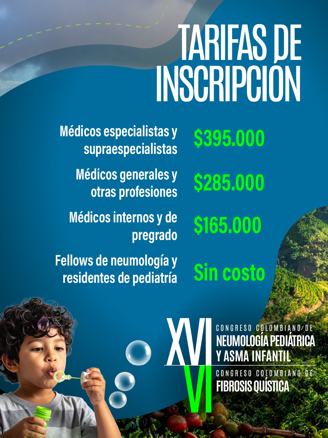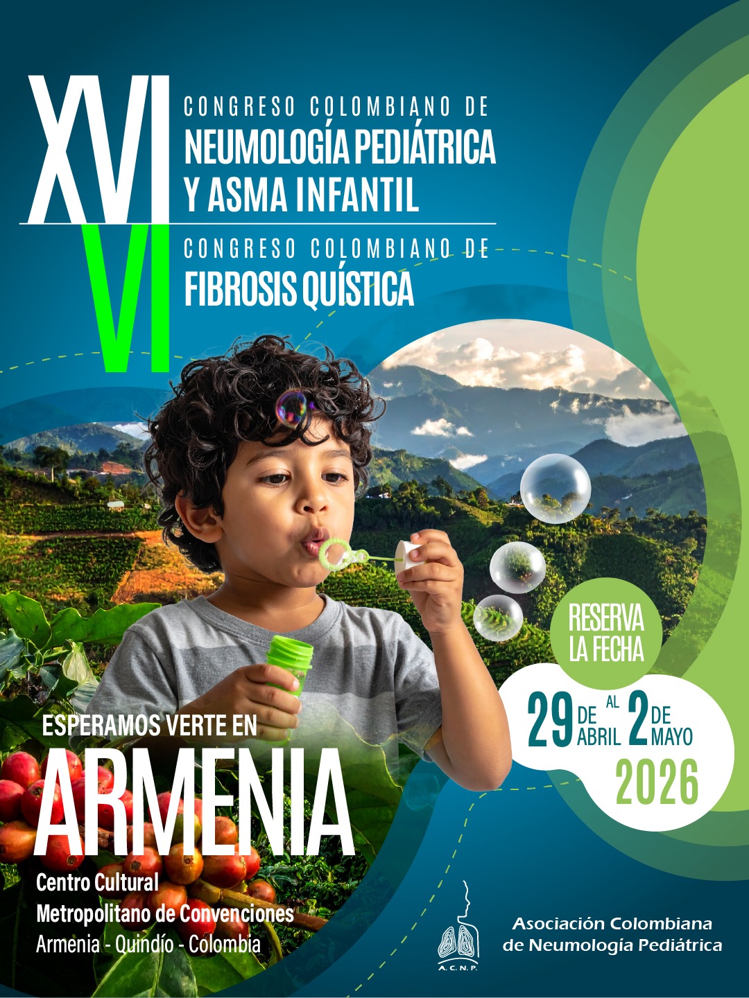 XVI Congreso Colombiano de Neumología Pediátrica y Asma Infantil y el VI Congreso Colombiano de Fibrosis Quística. + Añadir Google Calendar + exportación iCal / Outlook 00 días 00 horas 00 minutos 00 segundos Fecha Abr 29 2026 - May 02 2026 En marcha... Más Información Leer más Localización Centro Cultural Metropolitano de Convenciones Armenia-Quindio Filtro por Sociedad Asociación Colombiana de Neumología Pediátrica Teléfono 3163562156 Correo electrónico acneumoped@outlook.com Web https://portal.neumopediatriacolombia.com/ REGISTRO Compartir este evento